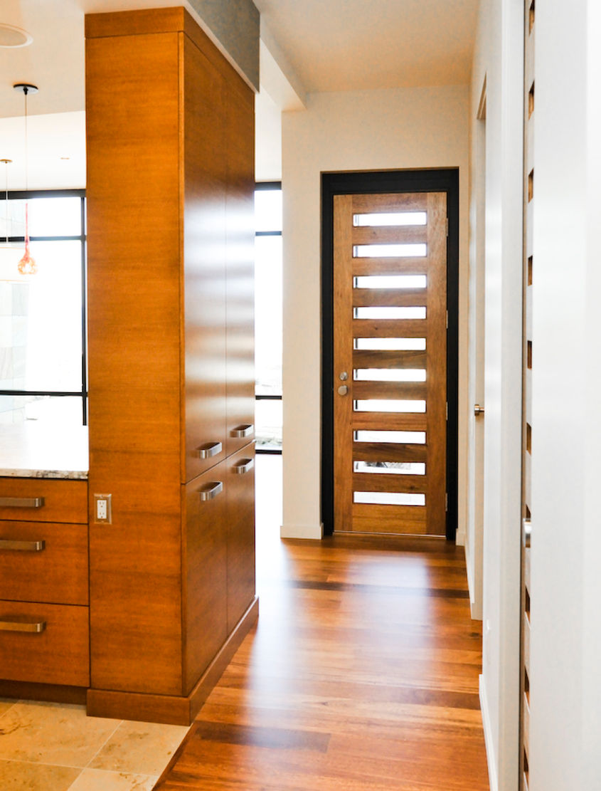 The Hylton front entrance door is crafted out of 100 percent Medieval Walnut. A modern door with lots of linear wood and glass. You will enjoy the tons of light that comes through the 30 windows. The Hylton is our busiest door, full of style, light and balance. A great choice for the modern home. Available with solid glass sidelights if you love the door but think the standard sidelights add too many linear lines.